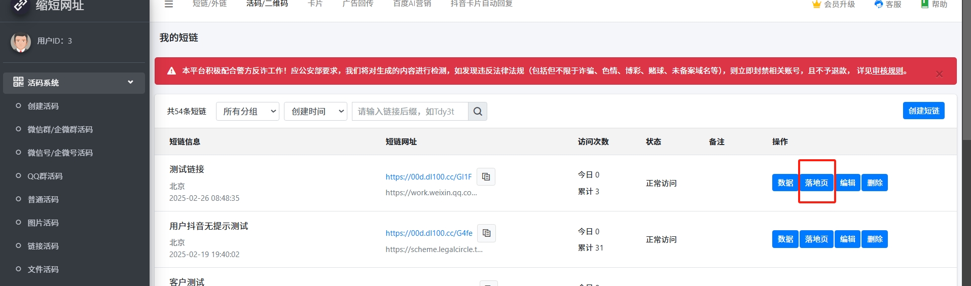 1.到管理后台,在链接的右侧有【落地页】功能,可以在打开此短链时,先展示落地页,再跳转最终链接