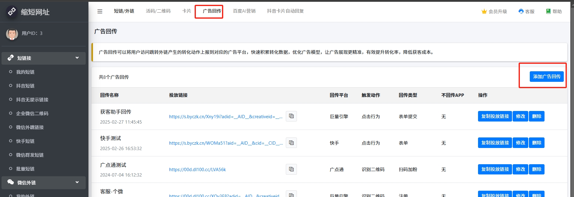 这里配置短链的事件和广告后台的回传事件之间的关联,进而实现自动回传广告效果